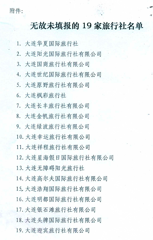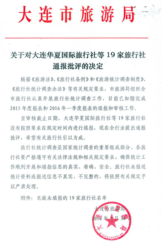 关于对大连华夏国际旅行社等19家旅行社通报批评的决定