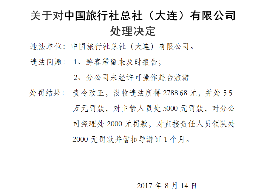 关于对中国旅行社总社(大连)有限公司处理决定(含个人)