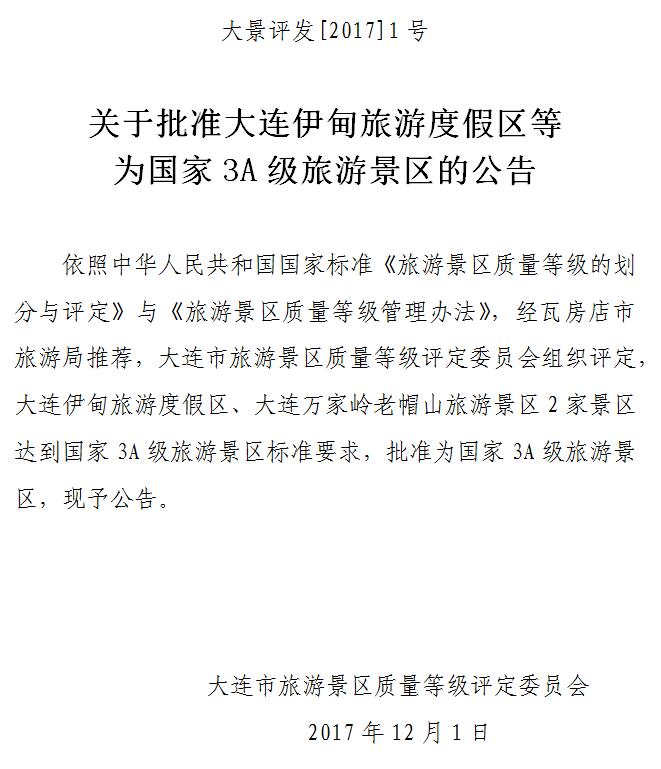 关于批准大连伊甸旅游度假区等为国家3A级旅游景区的公告