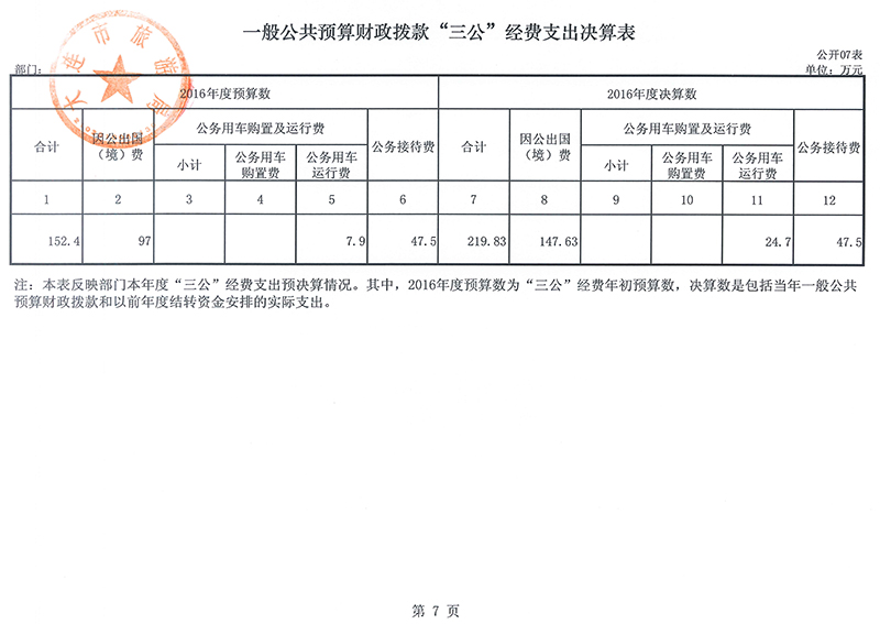 5.“三公”经费:指用财政拨款安排的因公出国(境)费、公务用车购置及运行费和公务接待费。其中,因公出国(境)费反映单位公务出国(境)的住宿费、旅费、伙食补助费、杂费、培训费等支出;公务用车购置及运行费反映单位公务用车购置费及租用费、燃料费、维修费、过路过桥费、保险费、安全奖励费用等支出;公务接待费反映单位按规定开支的各类公务接待(含外宾接待)支出。