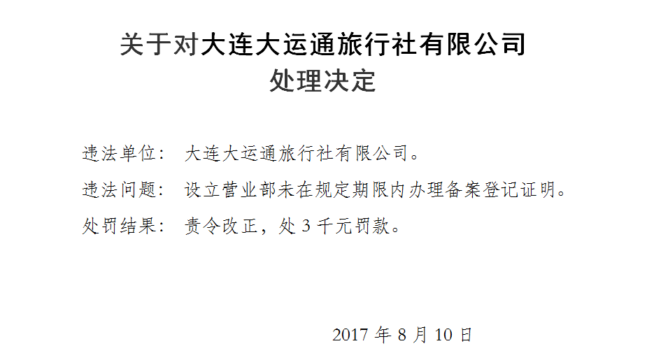 关于对大连大运通旅行社有限公司处理决定